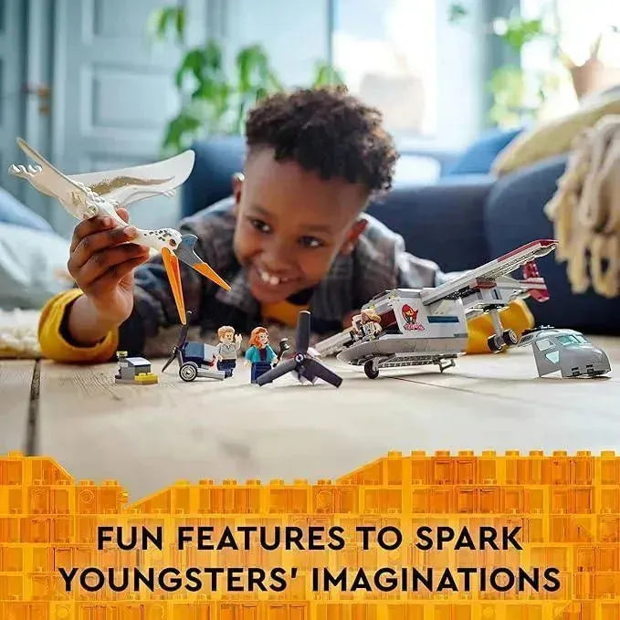 - Een stoer vliegtuig: Het vliegtuig heeft een cockpit met plaats voor 3 minifiguren (Owen Grady, Claire Dearing en Kayla Watts), draaiende propellers, een laadruimte die open kan en motoren die kunnen afbreken tijdens een aanval van de Quetzalcoatlus.