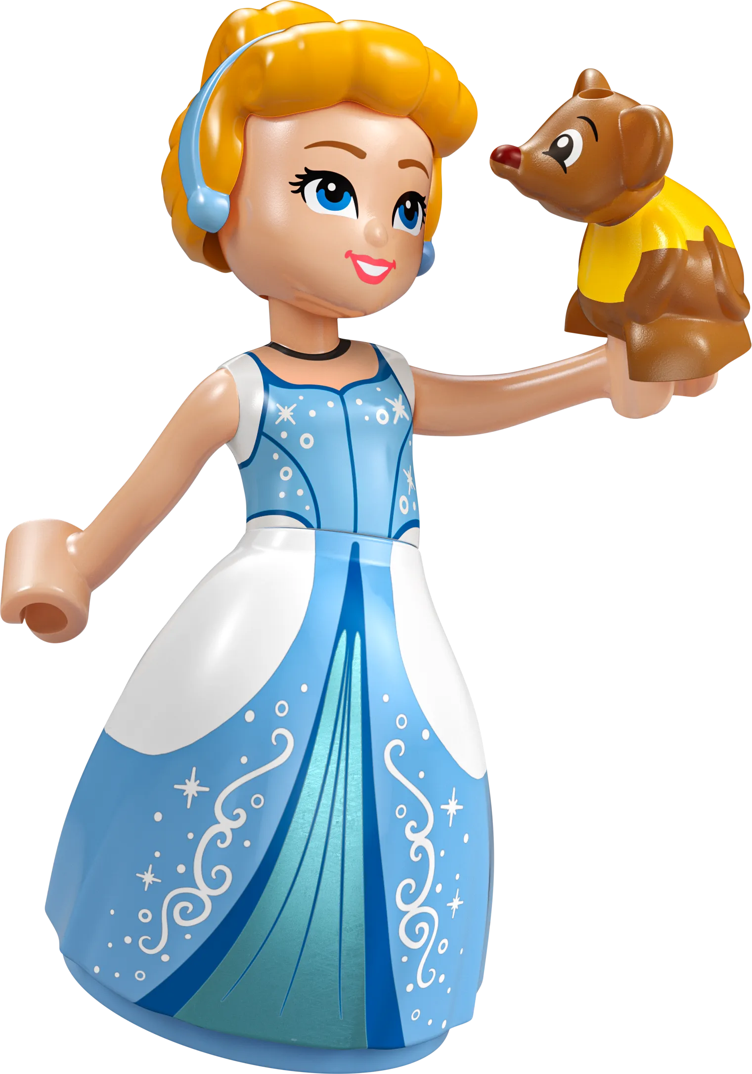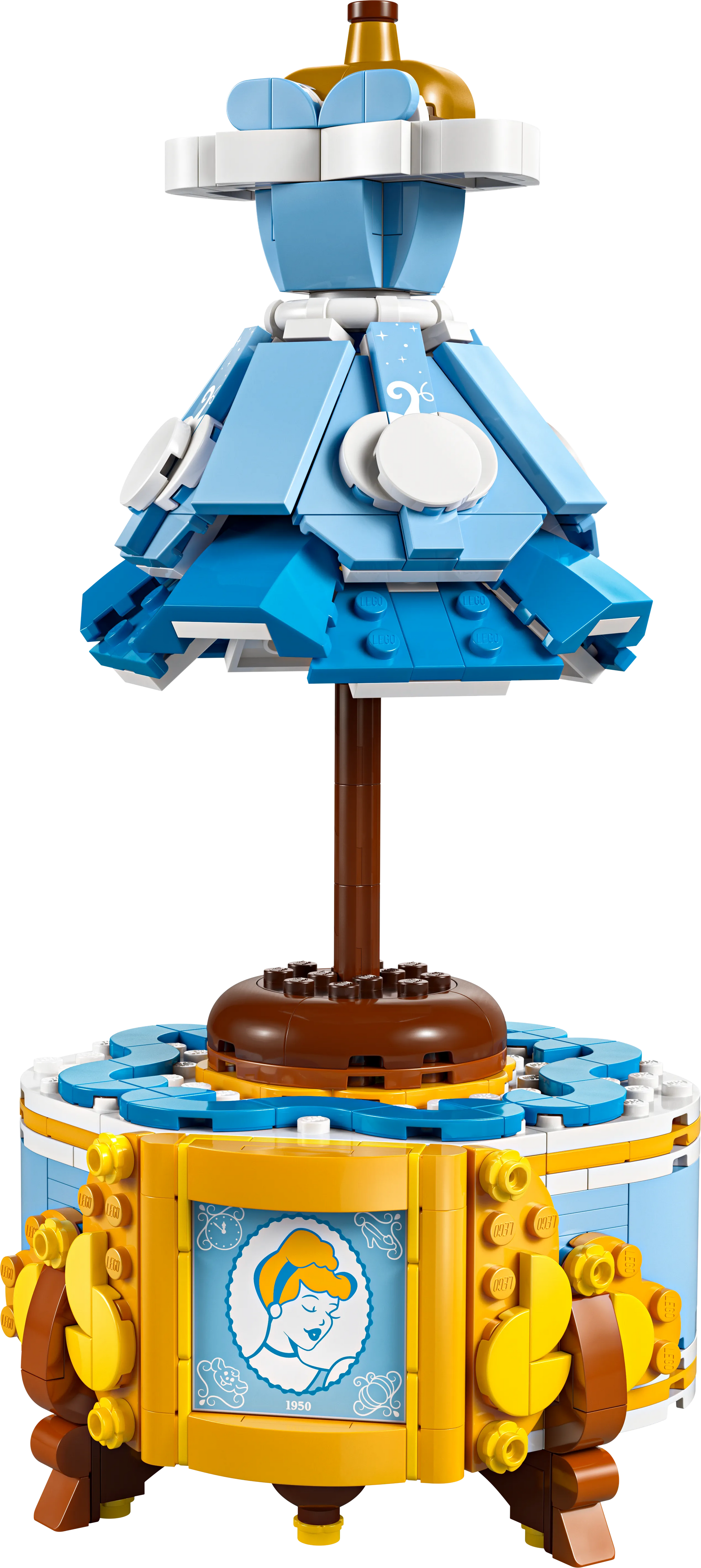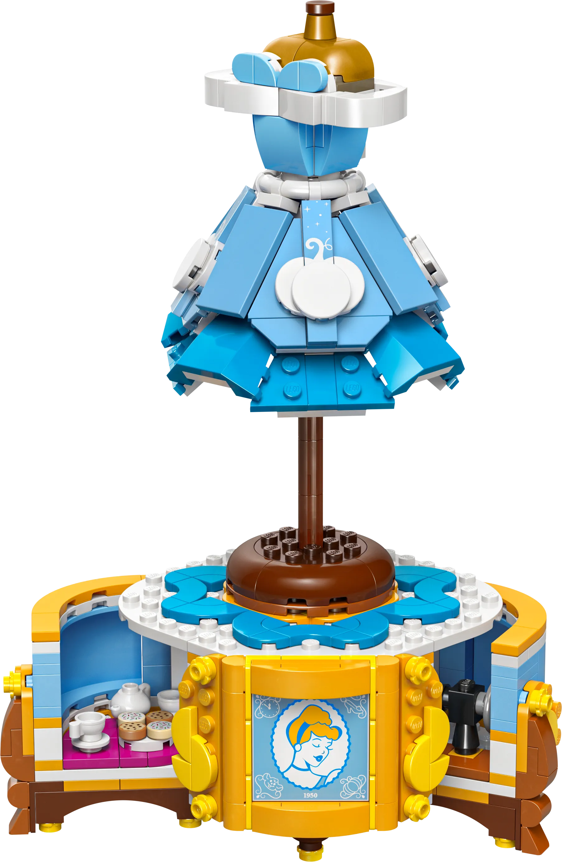 - Een iconische jurk in LEGO-vorm: Bouw een replica van Assepoesters prachtige baljurk, compleet met een lichtblauwe rok, een korset en een tiara. De jurk is voorzien van talloze details, zoals glittersteentjes en een elegante bloemenprint.
